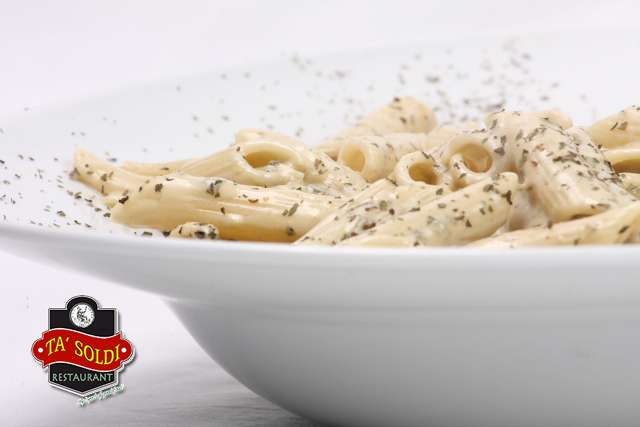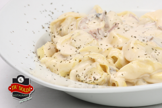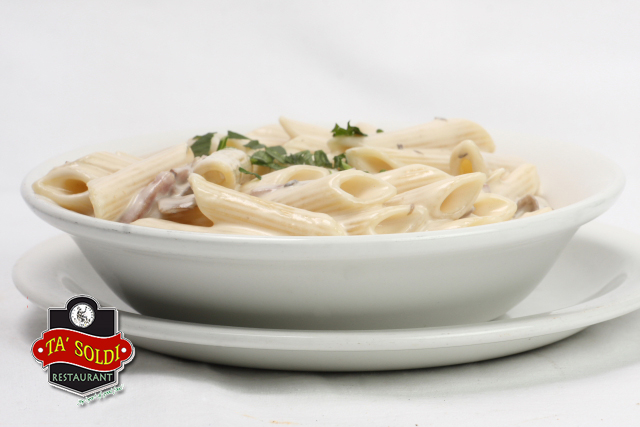 Served in a creamy sauce with bacon, mushrooms & chicken